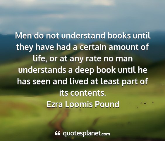 Men do not understand books until they have had a certain amount of life, or at any rate no man understands a deep book until he has seen and lived at least part of its contents.Ezra Loomis Pound
