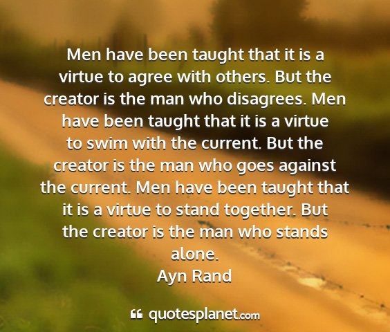 Men have been taught that it is a virtue to agree with others. But the creator is the man who disagrees. Men have been taught that it is a virtue to swim with the current. But the creator is the man who goes against the current. Men have been taught that it is a virtue to stand together. But the creator is the man who stands alone.Ayn Rand