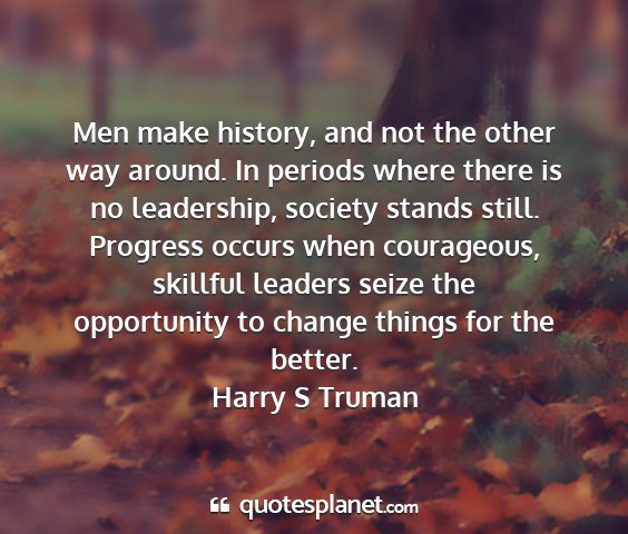 Men make history, and not the other way around. In periods where there is no leadership, society stands still. Progress occurs when courageous, skillful leaders seize the opportunity to change things for the better.Harry S Truman