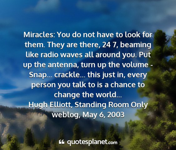 Miracles: You do not have to look for them. They are there, 24 7, beaming like radio waves all around you. Put up the antenna, turn up the volume - Snap... crackle... this just in, every person you talk to is a chance to change the world...Hugh Elliott, Standing Room Only weblog, May 6, 2003