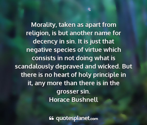 Morality, taken as apart from religion, is but another name for decency in sin. It is just that negative species of virtue which consists in not doing what is scandalously depraved and wicked. But there is no heart of holy principle in it, any more than there is in the grosser sin.Horace Bushnell