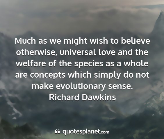Much as we might wish to believe otherwise, universal love and the welfare of the species as a whole are concepts which simply do not make evolutionary sense.Richard Dawkins