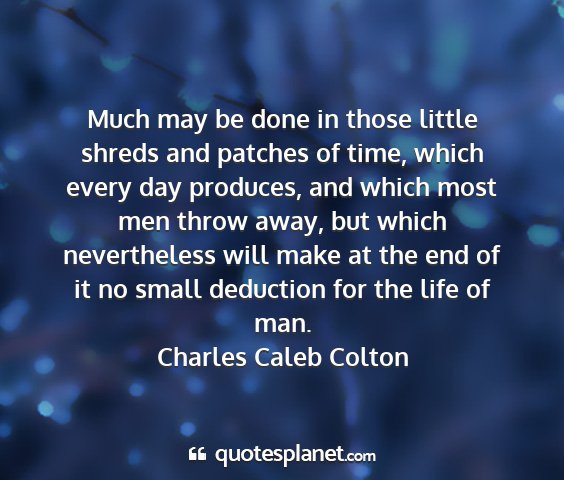 Much may be done in those little shreds and patches of time, which every day produces, and which most men throw away, but which nevertheless will make at the end of it no small deduction for the life of man.Charles Caleb Colton