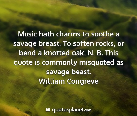 Music hath charms to soothe a savage breast, To soften rocks, or bend a knotted oak. N. B. This quote is commonly misquoted as savage beast.William Congreve