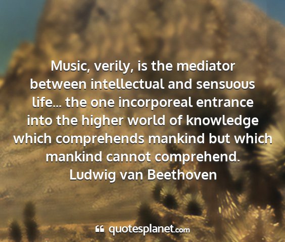 Music, verily, is the mediator between intellectual and sensuous life... the one incorporeal entrance into the higher world of knowledge which comprehends mankind but which mankind cannot comprehend.Ludwig van Beethoven