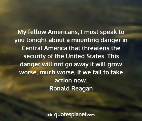 My fellow Americans, I must speak to you tonight about a mounting danger in Central America that threatens the security of the United States. This danger will not go away it will grow worse, much worse, if we fail to take action now.Ronald Reagan