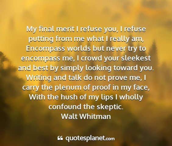 My final merit I refuse you, I refuse putting from me what I really am, Encompass worlds but never try to encompass me, I crowd your sleekest and best by simply looking toward you. Writing and talk do not prove me, I carry the plenum of proof in my face, With the hush of my lips I wholly confound the skeptic.Walt Whitman