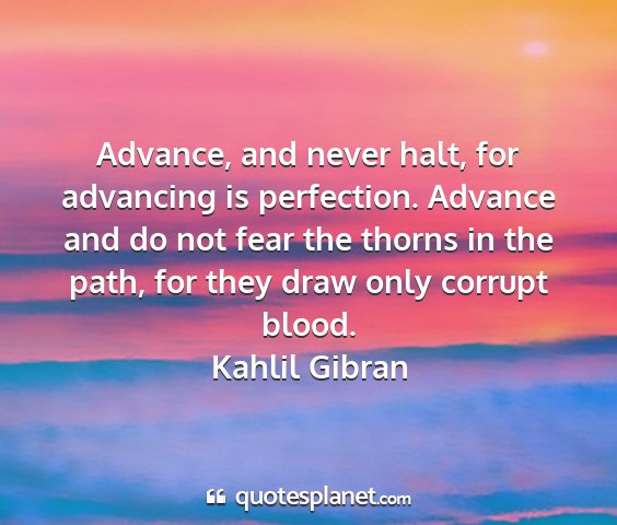 Advance, and never halt, for advancing is perfection. Advance and do not fear the thorns in the path, for they draw only corrupt blood.Kahlil Gibran