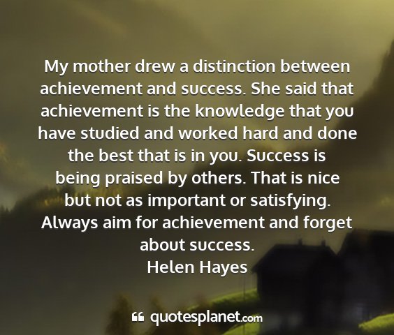My mother drew a distinction between achievement and success. She said that achievement is the knowledge that you have studied and worked hard and done the best that is in you. Success is being praised by others. That is nice but not as important or satisfying. Always aim for achievement and forget about success.Helen Hayes