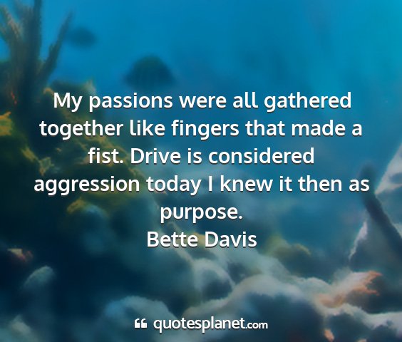My passions were all gathered together like fingers that made a fist. Drive is considered aggression today I knew it then as purpose.Bette Davis