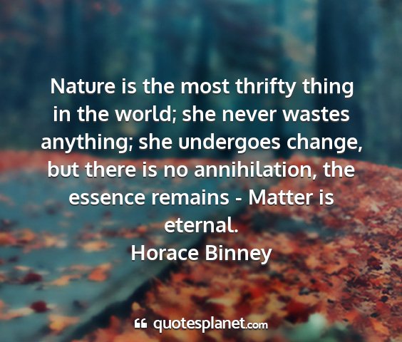 Nature is the most thrifty thing in the world; she never wastes anything; she undergoes change, but there is no annihilation, the essence remains - Matter is eternal.Horace Binney