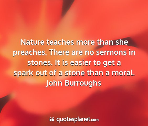 Nature teaches more than she preaches. There are no sermons in stones. It is easier to get a spark out of a stone than a moral.John Burroughs