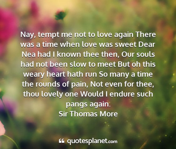 Nay, tempt me not to love again There was a time when love was sweet Dear Nea had I known thee then, Our souls had not been slow to meet But oh this weary heart hath run So many a time the rounds of pain, Not even for thee, thou lovely one Would I endure such pangs again.Sir Thomas More