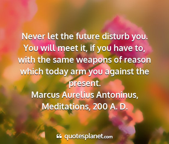 Never let the future disturb you. You will meet it, if you have to, with the same weapons of reason which today arm you against the present.Marcus Aurelius Antoninus, Meditations, 200 A. D.