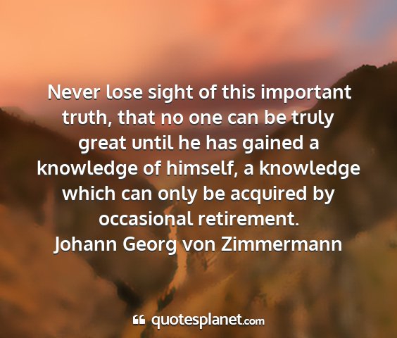Never lose sight of this important truth, that no one can be truly great until he has gained a knowledge of himself, a knowledge which can only be acquired by occasional retirement.Johann Georg von Zimmermann