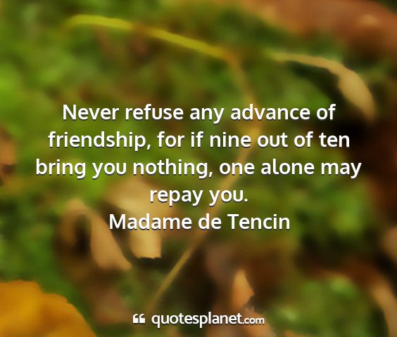 Never refuse any advance of friendship, for if nine out of ten bring you nothing, one alone may repay you.Madame de Tencin