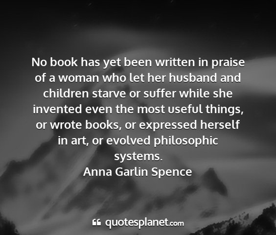 No book has yet been written in praise of a woman who let her husband and children starve or suffer while she invented even the most useful things, or wrote books, or expressed herself in art, or evolved philosophic systems.Anna Garlin Spence