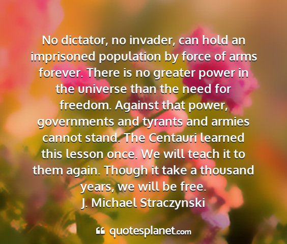 No dictator, no invader, can hold an imprisoned population by force of arms forever. There is no greater power in the universe than the need for freedom. Against that power, governments and tyrants and armies cannot stand. The Centauri learned this lesson once. We will teach it to them again. Though it take a thousand years, we will be free.J. Michael Straczynski