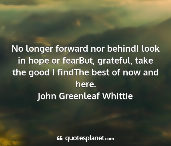 No longer forward nor behindI look in hope or fearBut, grateful, take the good I findThe best of now and here.John Greenleaf Whittie