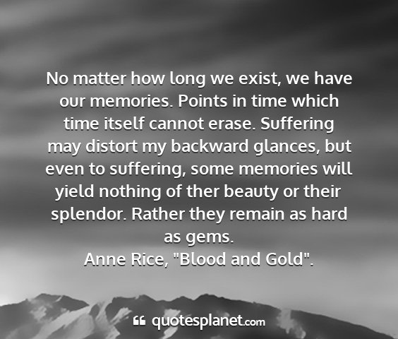 No matter how long we exist, we have our memories. Points in time which time itself cannot erase. Suffering may distort my backward glances, but even to suffering, some memories will yield nothing of ther beauty or their splendor. Rather they remain as hard as gems.Anne Rice, "Blood and Gold".