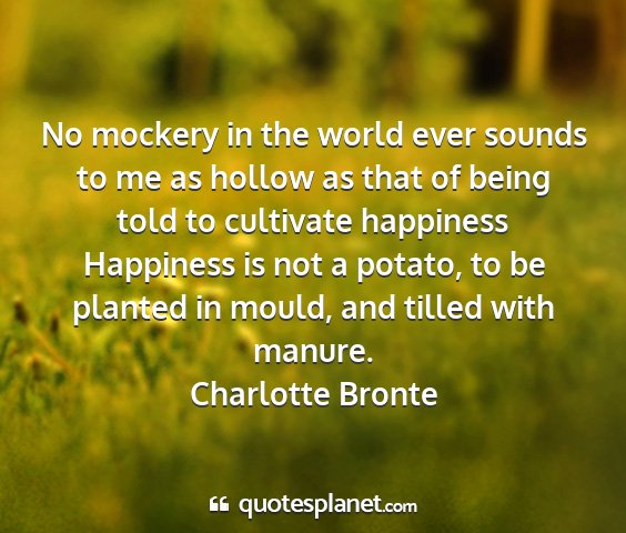 No mockery in the world ever sounds to me as hollow as that of being told to cultivate happiness Happiness is not a potato, to be planted in mould, and tilled with manure.Charlotte Bronte