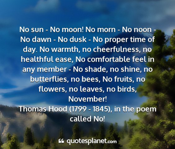 No sun - No moon! No morn - No noon - No dawn - No dusk - No proper time of day. No warmth, no cheerfulness, no healthful ease, No comfortable feel in any member - No shade, no shine, no butterflies, no bees, No fruits, no flowers, no leaves, no birds, November!Thomas Hood (1799 - 1845), in the poem called No!