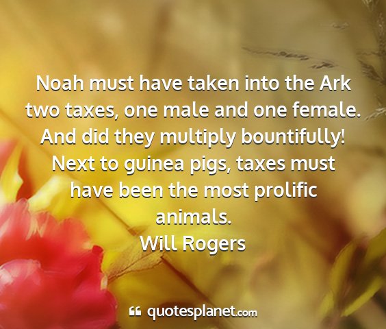 Noah must have taken into the Ark two taxes, one male and one female. And did they multiply bountifully! Next to guinea pigs, taxes must have been the most prolific animals.Will Rogers