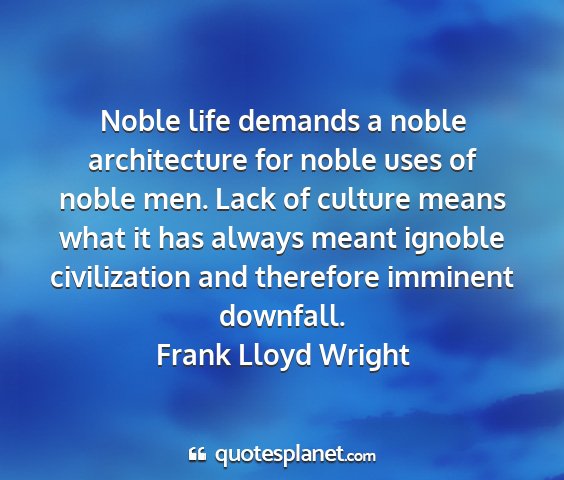 Noble life demands a noble architecture for noble uses of noble men. Lack of culture means what it has always meant ignoble civilization and therefore imminent downfall.Frank Lloyd Wright