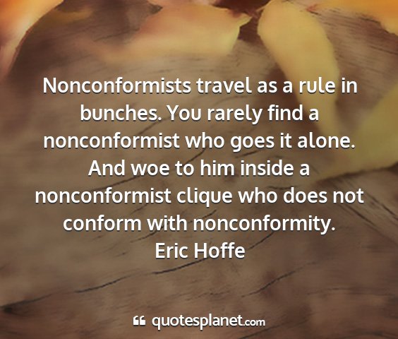 Nonconformists travel as a rule in bunches. You rarely find a nonconformist who goes it alone. And woe to him inside a nonconformist clique who does not conform with nonconformity.Eric Hoffe