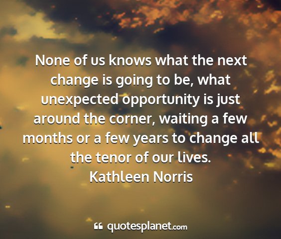 None of us knows what the next change is going to be, what unexpected opportunity is just around the corner, waiting a few months or a few years to change all the tenor of our lives.Kathleen Norris