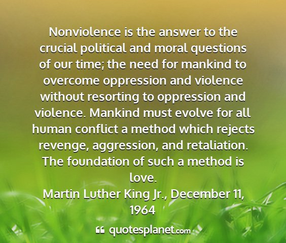 Nonviolence is the answer to the crucial political and moral questions of our time; the need for mankind to overcome oppression and violence without resorting to oppression and violence. Mankind must evolve for all human conflict a method which rejects revenge, aggression, and retaliation. The foundation of such a method is love.Martin Luther King Jr., December 11, 1964