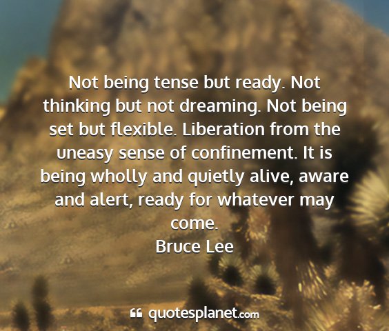 Not being tense but ready. Not thinking but not dreaming. Not being set but flexible. Liberation from the uneasy sense of confinement. It is being wholly and quietly alive, aware and alert, ready for whatever may come.Bruce Lee