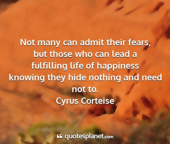 Not many can admit their fears, but those who can lead a fulfilling life of happiness knowing they hide nothing and need not to.Cyrus Corteise