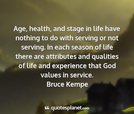 Age, health, and stage in life have nothing to do with serving or not serving. In each season of life there are attributes and qualities of life and experience that God values in service.Bruce Kempe