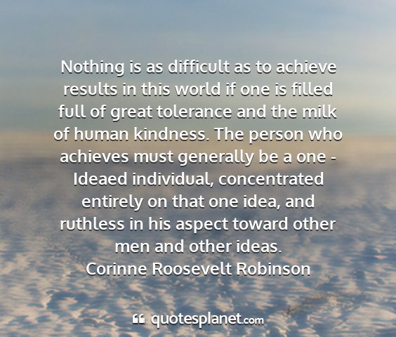 Nothing is as difficult as to achieve results in this world if one is filled full of great tolerance and the milk of human kindness. The person who achieves must generally be a one - Ideaed individual, concentrated entirely on that one idea, and ruthless in his aspect toward other men and other ideas.Corinne Roosevelt Robinson