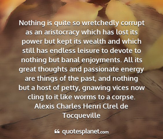 Nothing is quite so wretchedly corrupt as an aristocracy which has lost its power but kept its wealth and which still has endless leisure to devote to nothing but banal enjoyments. All its great thoughts and passionate energy are things of the past, and nothing but a host of petty, gnawing vices now cling to it like worms to a corpse.Alexis Charles Henri Clrel de Tocqueville
