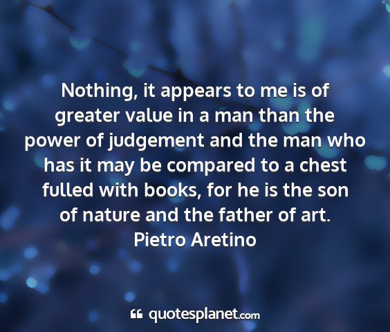 Nothing, it appears to me is of greater value in a man than the power of judgement and the man who has it may be compared to a chest fulled with books, for he is the son of nature and the father of art.Pietro Aretino