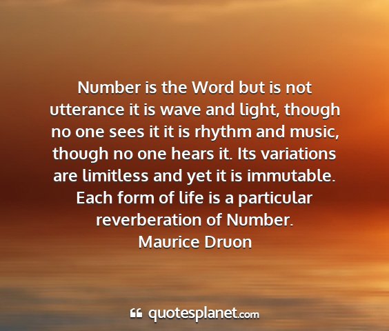 Number is the Word but is not utterance it is wave and light, though no one sees it it is rhythm and music, though no one hears it. Its variations are limitless and yet it is immutable. Each form of life is a particular reverberation of Number.Maurice Druon