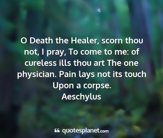 O Death the Healer, scorn thou not, I pray, To come to me: of cureless ills thou art The one physician. Pain lays not its touch Upon a corpse.Aeschylus