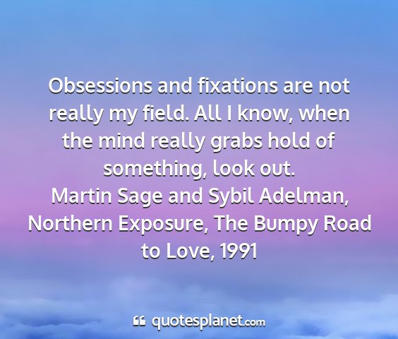 Obsessions and fixations are not really my field. All I know, when the mind really grabs hold of something, look out.Martin Sage and Sybil Adelman, Northern Exposure, The Bumpy Road to Love, 1991