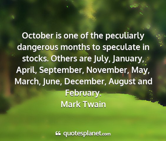 October is one of the peculiarly dangerous months to speculate in stocks. Others are July, January, April, September, November, May, March, June, December, August and February.Mark Twain