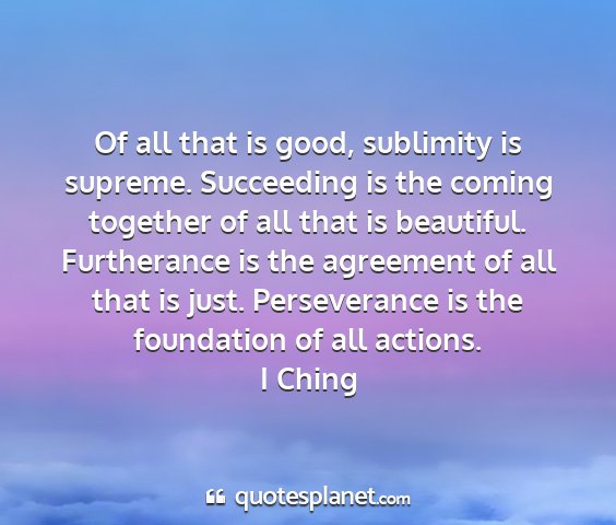 Of all that is good, sublimity is supreme. Succeeding is the coming together of all that is beautiful. Furtherance is the agreement of all that is just. Perseverance is the foundation of all actions.I Ching