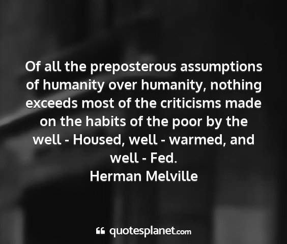 Of all the preposterous assumptions of humanity over humanity, nothing exceeds most of the criticisms made on the habits of the poor by the well - Housed, well - warmed, and well - Fed.Herman Melville