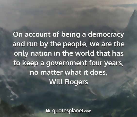 On account of being a democracy and run by the people, we are the only nation in the world that has to keep a government four years, no matter what it does.Will Rogers