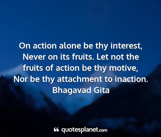 On action alone be thy interest, Never on its fruits. Let not the fruits of action be thy motive, Nor be thy attachment to inaction.Bhagavad Gita
