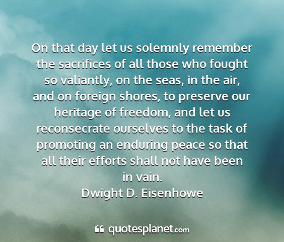 On that day let us solemnly remember the sacrifices of all those who fought so valiantly, on the seas, in the air, and on foreign shores, to preserve our heritage of freedom, and let us reconsecrate ourselves to the task of promoting an enduring peace so that all their efforts shall not have been in vain.Dwight D. Eisenhowe