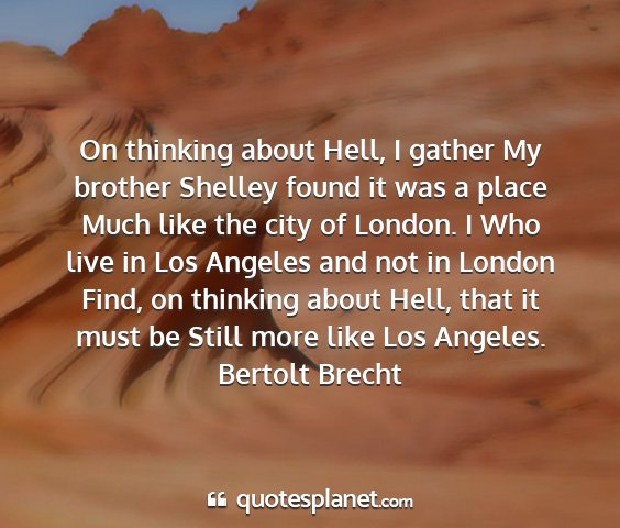 On thinking about Hell, I gather My brother Shelley found it was a place Much like the city of London. I Who live in Los Angeles and not in London Find, on thinking about Hell, that it must be Still more like Los Angeles.Bertolt Brecht