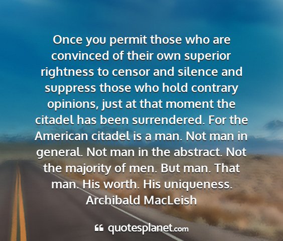 Once you permit those who are convinced of their own superior rightness to censor and silence and suppress those who hold contrary opinions, just at that moment the citadel has been surrendered. For the American citadel is a man. Not man in general. Not man in the abstract. Not the majority of men. But man. That man. His worth. His uniqueness.Archibald MacLeish