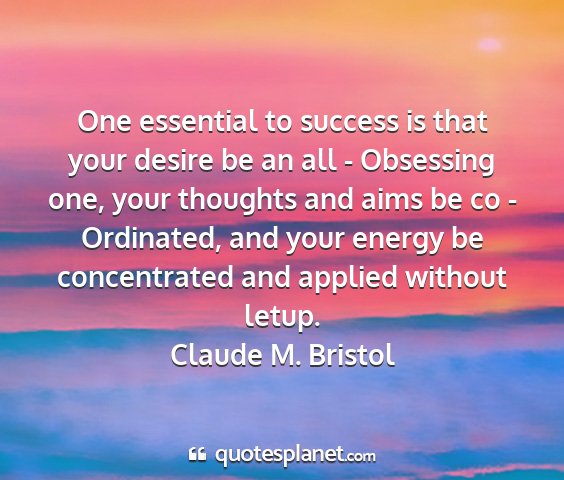One essential to success is that your desire be an all - Obsessing one, your thoughts and aims be co - Ordinated, and your energy be concentrated and applied without letup.Claude M. Bristol