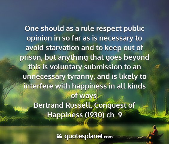 One should as a rule respect public opinion in so far as is necessary to avoid starvation and to keep out of prison, but anything that goes beyond this is voluntary submission to an unnecessary tyranny, and is likely to interfere with happiness in all kinds of ways.Bertrand Russell, Conquest of Happiness (1930) ch. 9
